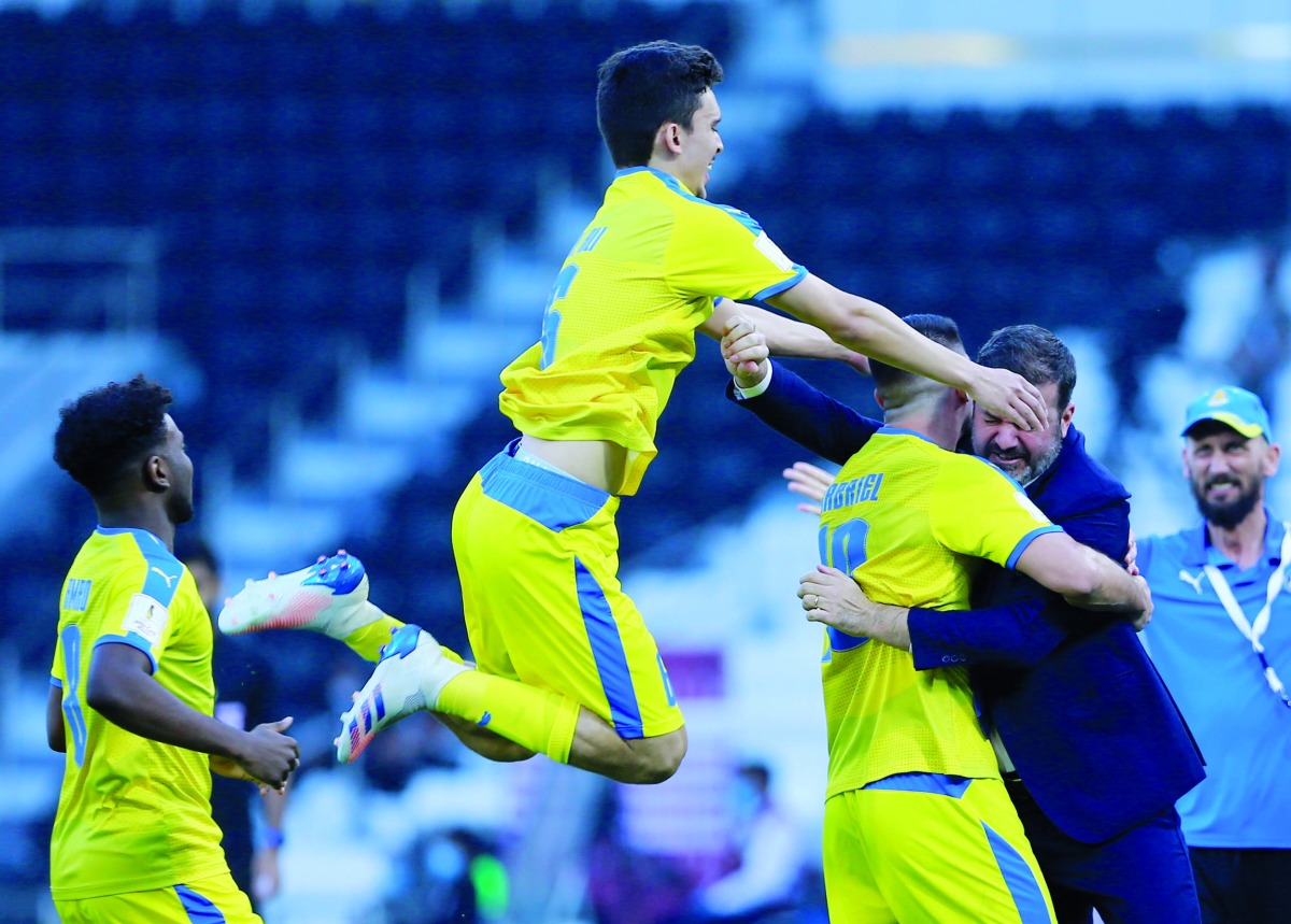 Al Gharafa players and coach Andrea Stramaccioni celebrate after defeating Al Wakrah, yesterday.