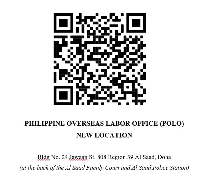 The contact number and email addresses of POLO Qatar will also remain the same, with its hotline number still (+974) 3318-2459 and its email addresses at polo_qatar@dole.gov.ph or polodoha@gmail.com.