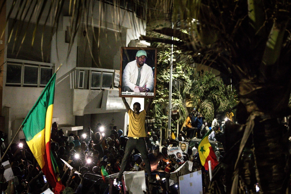 Supporters of Senegalese opposition leader Ousmane Sonko and presidential candidate Bassirou Diomaye Faye celebrate after the two men were released from prison, in Dakar on March 14, 2024. (Photo by John Wessels / AFP)