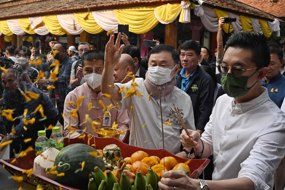 Thailand's former prime minister Thaksin Shinawatra (C) makes merit at Wat Phra That Doi Suthep Buddhist temple in Chiang Mai on March 15, 2024. Photo by Lillian SUWANRUMPHA / AFP