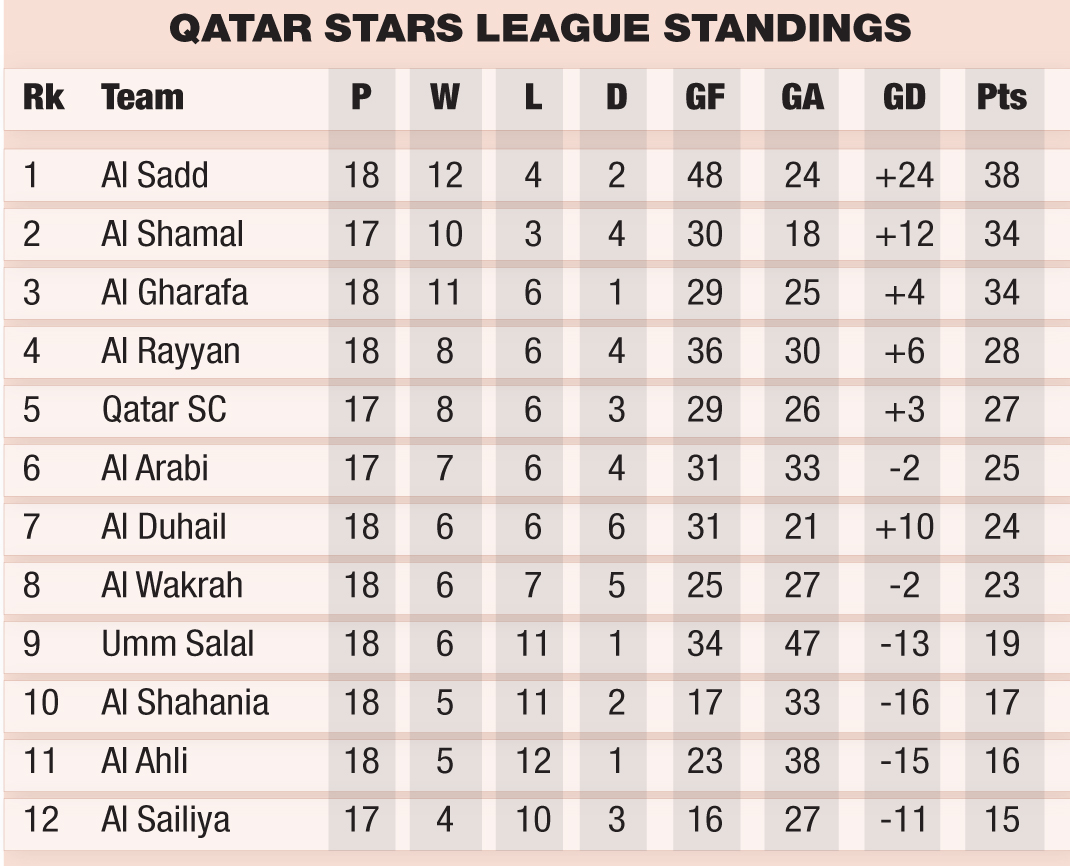 Doha, Qatar: The Qatar Stars League (QSL) title race remains wide open heading into Round 19, with both Al Shamal and Al Gharafa firmly in contention to catch leaders Al Sadd after an eventful Round 18 that also intensified the fight for the top four and the battle to avoid relegation.