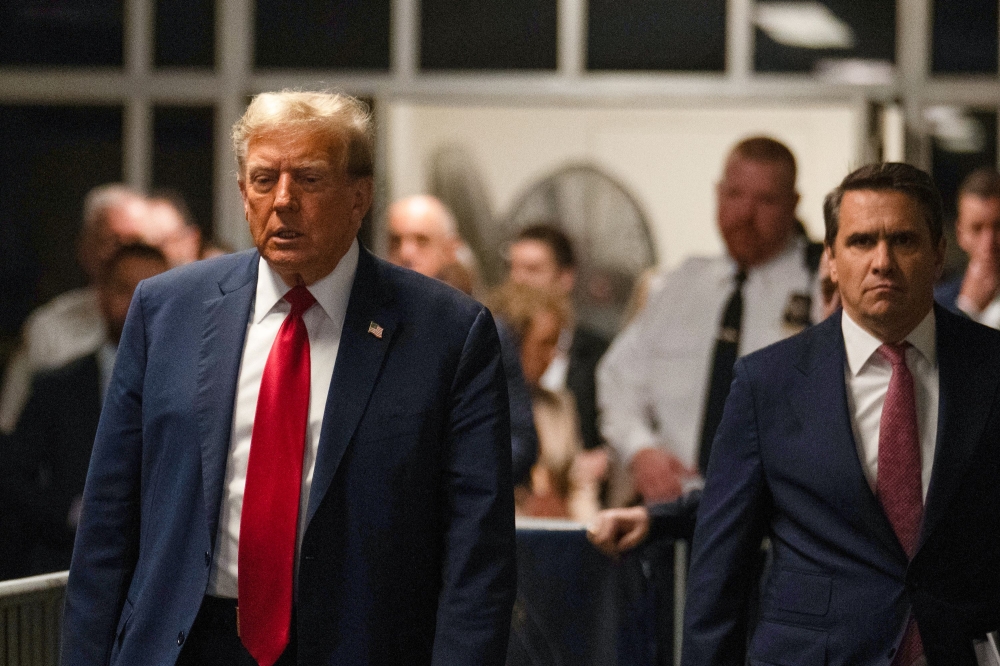 Former US President Donald Trump arrives at Manhattan Criminal Court as he attends the first day of his trial for allegedly covering up hush money payments linked to extramarital affairs, in New York City on April 15, 2024. Photo by Adam GRAY / AFP.