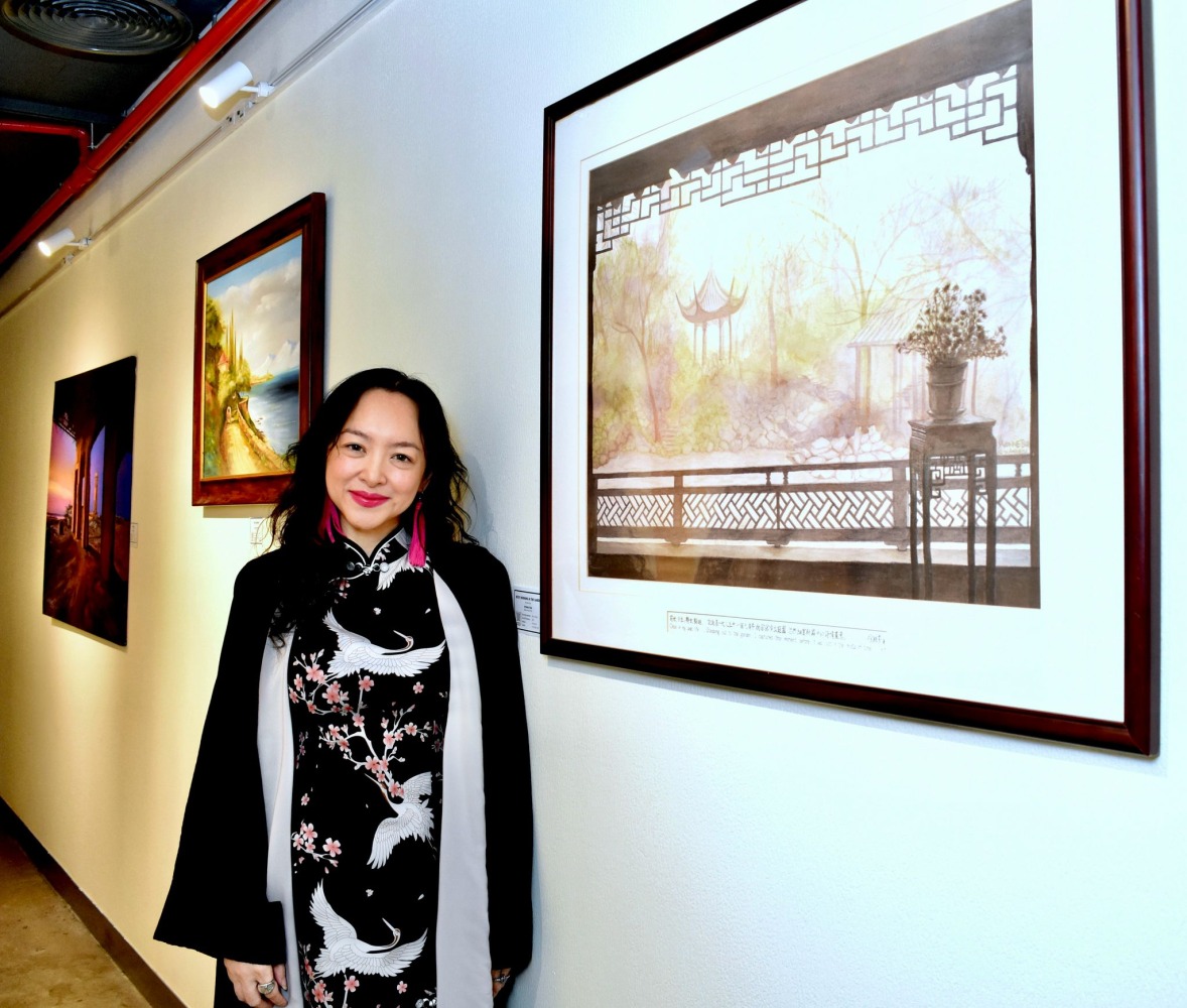 Yvonne Tsui with her “Misty Morning in the Garden” 76cm x 56cm watercolour painting