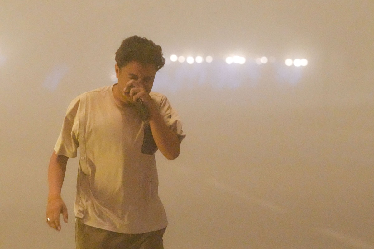 A pedestrian struggles to breathe as he walks along the side of a road through low visibility conditions due to a massive dust storm in Iraq's central city of Najaf on April 14, 2025. (Photo by Qassem al-KAABI / AFP)