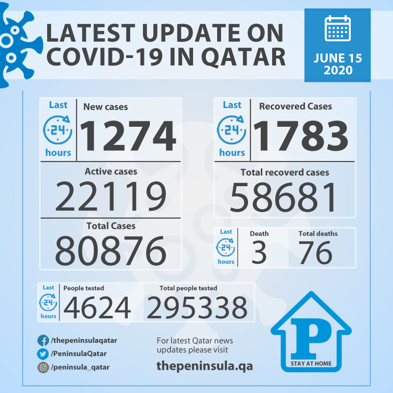 Ministry of Public Health today announced 1,274 confirmed new cases of coronavirus (COVID-19), with 1,783 people recovered in the last 24 hours, bringing the total number of people recovered in Qatar to 58,681 cases, in addition to recording 3 new deaths.