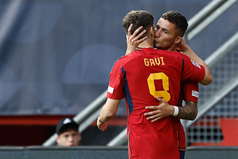 Spain's forward Yeremy Pino (right) celebrates scoring his team's first goal with Spain's midfielder Gavi (left) during the UEFA Nations League semi final football match between Spain and Italy at the De Grolsch Veste Stadium in Enschede on June 15, 2023. (Photo by KENZO TRIBOUILLARD / AFP)
