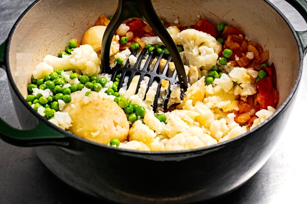 The dish is refreshingly flexible in other ways; while it usually includes potatoes and peas, it’s perfectly acceptable to use whatever vegetables you have on hand, as long as they’re mashable. Shah includes cauliflower in hers, but the first time I made it, I took it as part of a meal train to a friend who can’t stand the crucifer, so I doubled up on the peas instead. At home, where my husband is an avowed pea hater, I doubled up on the cauliflower.