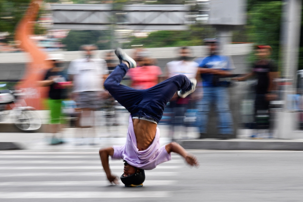 Venezuelan professional breakdance athlete Kenyer Mendez, 27, who has gone viral by performing a head slide trick to make a living dancing at Colombia's traffic lights and dreams of joining Venezuela's first Olympic breakdance team in 2024, performs at a traffic light, in Caracas, Venezuela, recently. (REUTERS/Gaby Oraa)