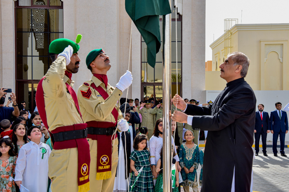 Ambassador H E Syed Ahsan Raza Shah hoisted the Pakistan Flag at the Embassy premises in Doha’s diplomatic area. National Anthem was recited in unison by the assembled audience on the occasion.