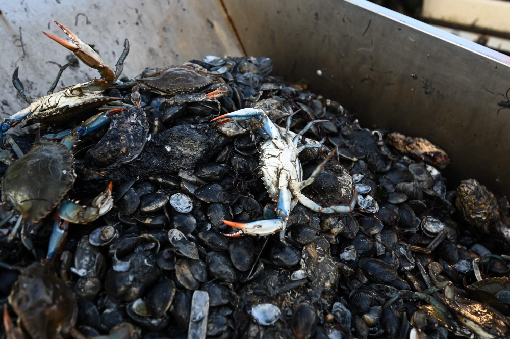 Blue crabs lay amongst clam shells on a fisherman boat on August 11, 2023 in the lagoon of Scardovari, south of Venice, Italy. (Photo by Piero Cruciatti / AFP)