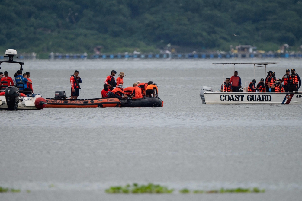 In this photo taken on July 17, 2025, Philippine Coast Guard personnel search for missing cockfighters in Taal Lake, off Laurel town south of Manila. (Photo by Ted Aljibe / AFP)