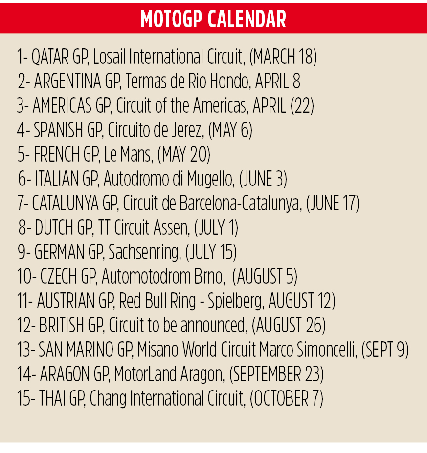 Paris: Losail International Circuit topped provisional 2018 MotoGP calendar, which was announced by MotoGP bosses yesterday, revealing a 19-race schedule that will begin on March 18, though no venue for the British Grand Prix.