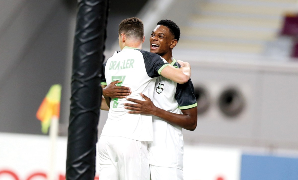 Al Ahli's Julian Draxler (left) celebrates with a teammate after scoring a goal against Qatar SC.