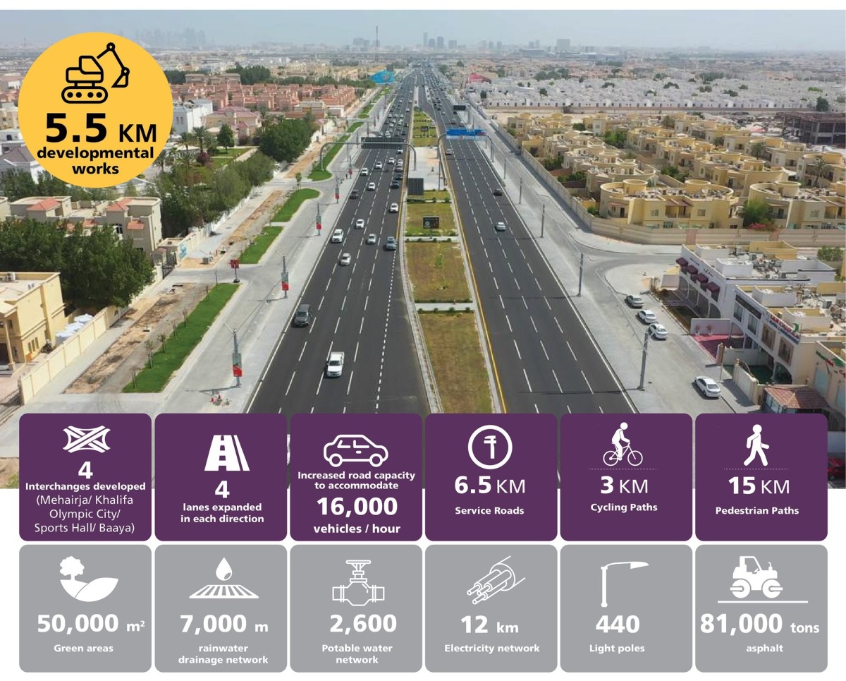 Ashghal improved the previous road from 3 lanes into 4 lanes in each direction linking Sabah Al Ahmad Corridor to Al Furousiya Street, while developing parts of the surrounding local roads. Four junctions have also been developed, namely Mehairja intersection, Khalifa Olympic City Intersection, Sports Hall Intersection and Baaya Intersection. As a result, it increases the road capacity from 12,000 vehicles per hour to 16,000 vehicles per hour, providing Al Waab Road users with accesses to the residential areas and facilitating the access to the shopping malls, sport and recreational facilities in the area.