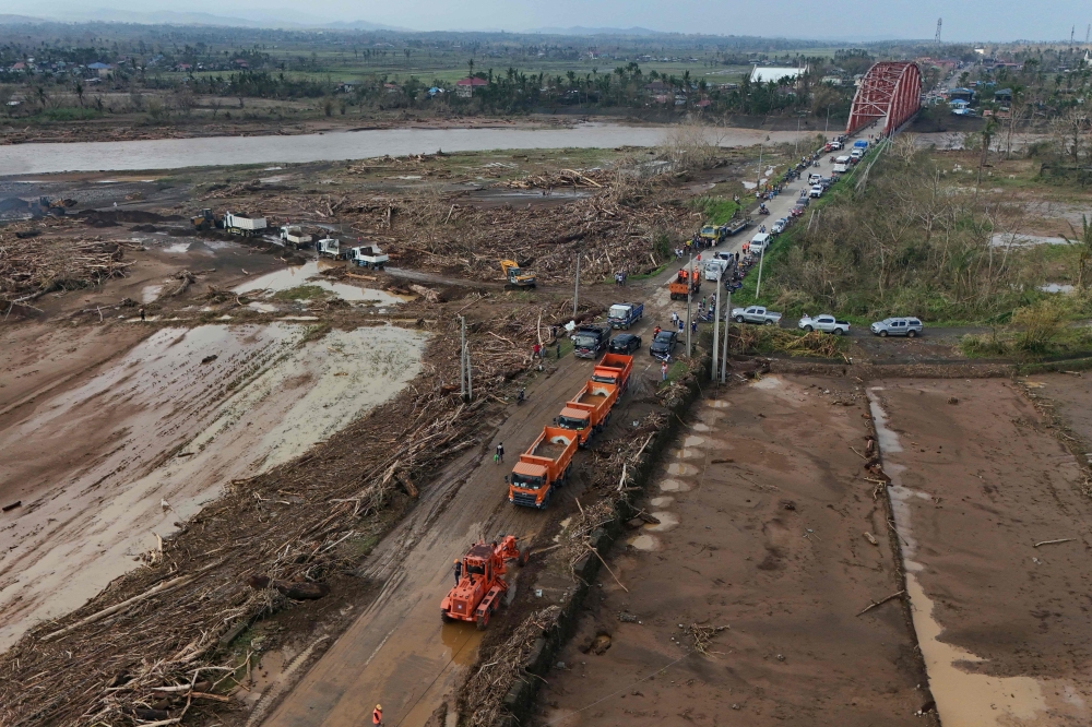 This handout photo taken on November 15, 2024 and received courtesy of the Bloggers of Tuguegarao Facebook page shows an aerial view of workers clearing debris from a road in Gonzaga town, Cagayan province, a day after Typhoon Usagi hit the province. Photo by Handout / BLOGGERS OF TUGUEGARAO FACEBOOK PAGE / AFP
