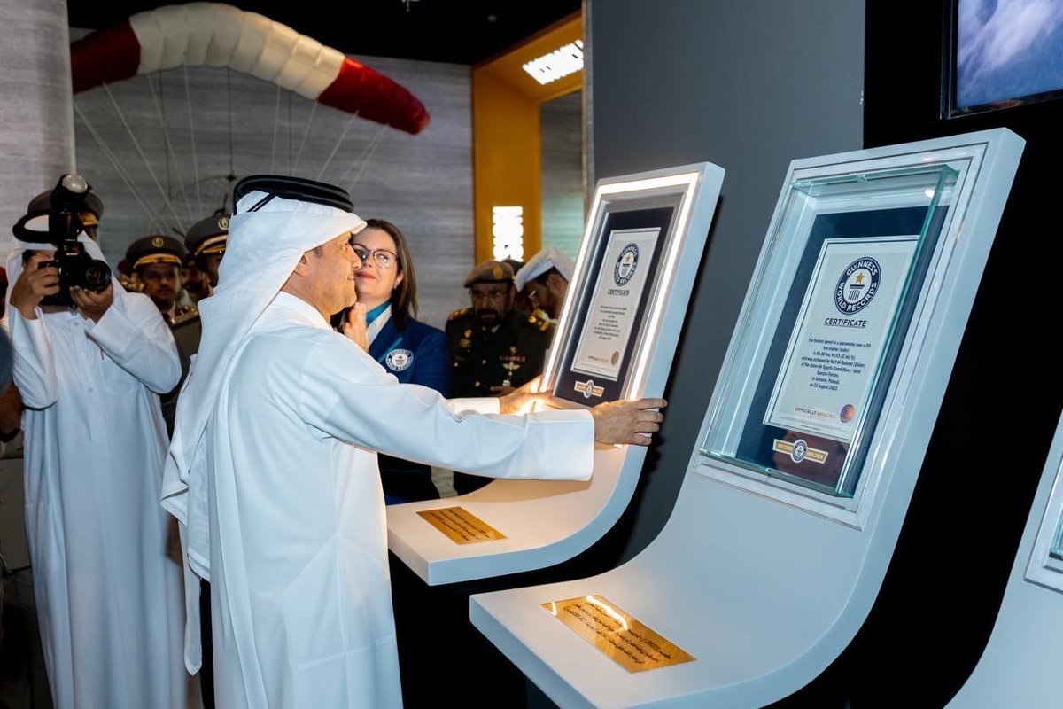 Meanwhile, HE Deputy Prime Minister and Minister of State for Defence Affairs Sheikh Saoud bin Abdulrahman bin Hassan Al-Thani received a Guinness World Records certificate in recognition of the State of Qatar's exceptional accomplishment of organizing the largest military parachute air display, with the participation of a large number of international teams and in accordance with internationally recognized standards