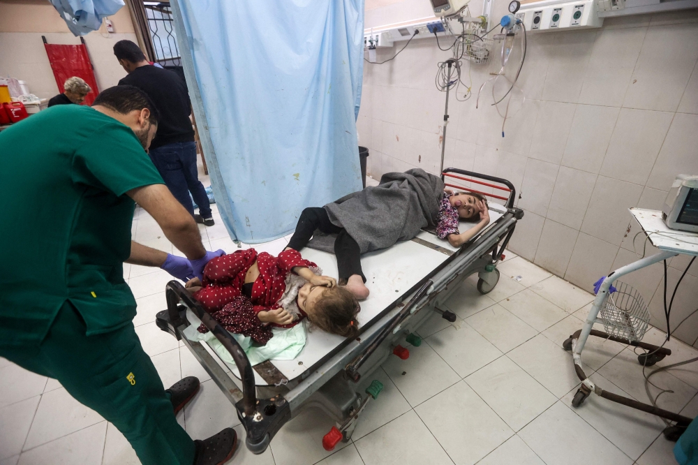 Palestinian children receive medical attetion at Nasser hospital in Khan Yunis in southern Gaza Strip following Israeli bombardment on December 15, 2023. Photo by AFP