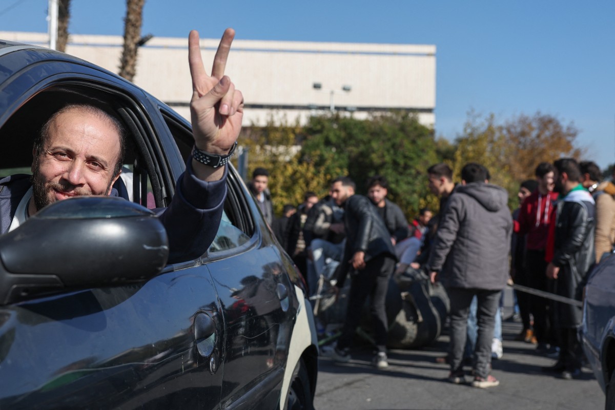A driver flashes the victory sign as students drag the statue of late president Hafez al-Assad during a rally near the campus of the Damascus University in the Syrian capital on December 15, 2024. Photo by Omar HAJ KADOUR / AFP.