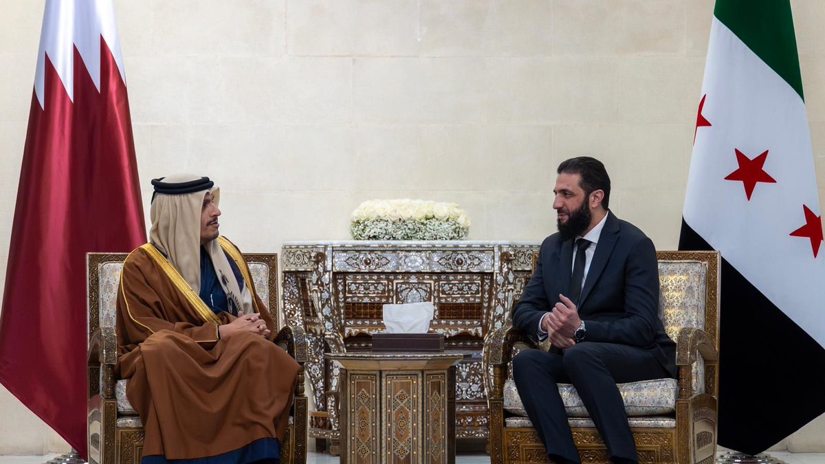 Damascus: Prime Minister and Minister of Foreign Affairs HE Sheikh Mohammed bin Abdulrahman bin Jassim Al Thani met with the leader of the new administration in Syria, HE Ahmed Al Sharaa, at Al Shaab Palace in Damascus today, January 16.