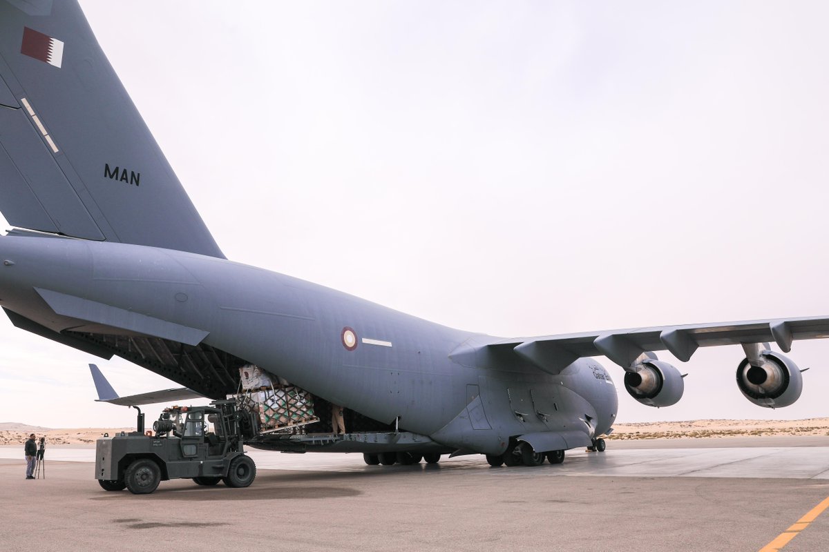 El Arish: A Qatari Armed Forces plane arrived in the city of El Arish in Egypt, carrying 30 tonnes of aid, including food supplies, provided by Qatar Red Crescent Society, bringing the total number of planes to 78, with a total of 2,334 tonnes of aid.