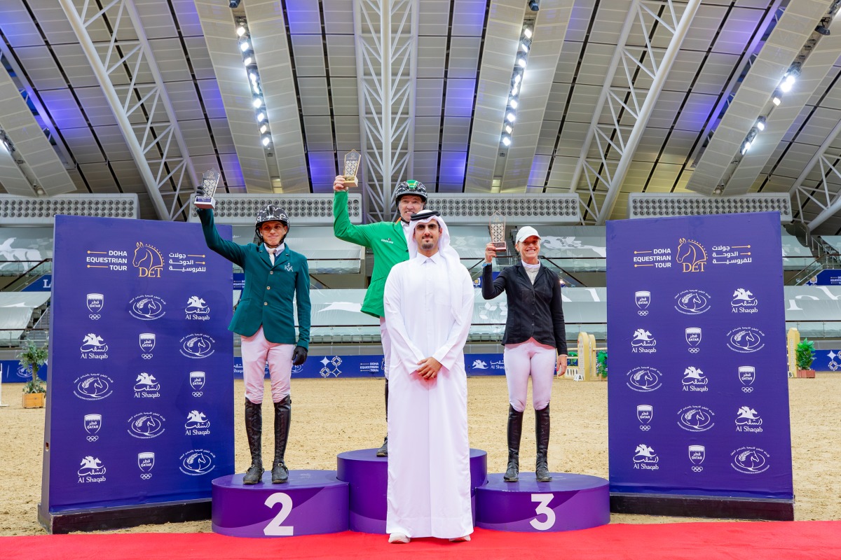 The final Diamond League competition 150 cm with a jump-off, was won by Austrian Geoffrey Backe on Equitron in 30.54 seconds. Al-Sharbatly took second on Valentino (31.2 seconds), and Vanderveen finished third on Starbucks (31.68 seconds). All three completed the course without faults. Awards were presented by Sheikh Talal bin Khalid Al Thani, assistant tournament director.Assistant Tournament Director Sheikh Talal bin Khalid Al-Thani honoured the winners of Diamond category.