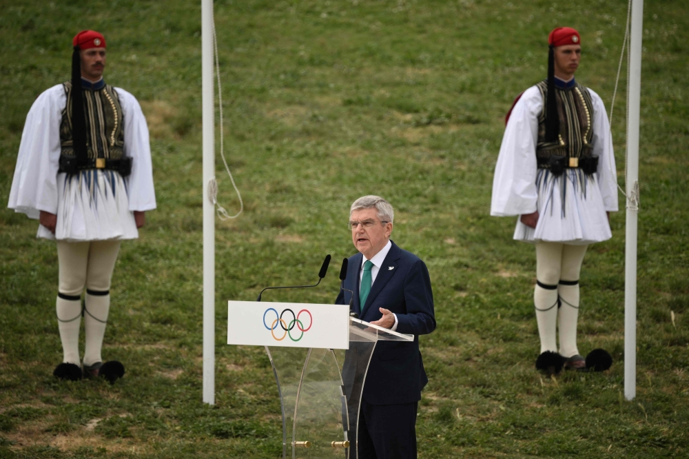 President of the International Olympic Committee (IOC) Thomas Bach (C) delivers a speech next to Greek presidential guards during the Olympic torch lighting ceremony. (Photo by Angelos Tzortzinis / AFP)