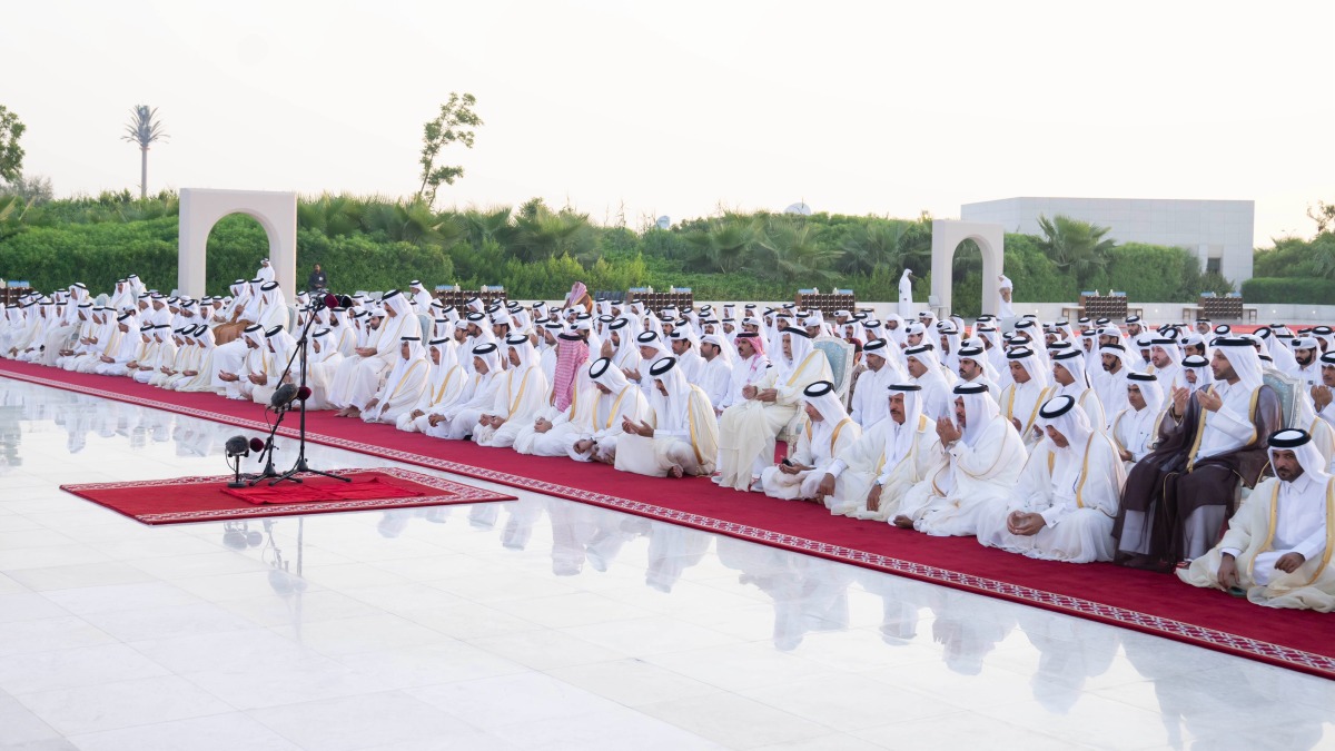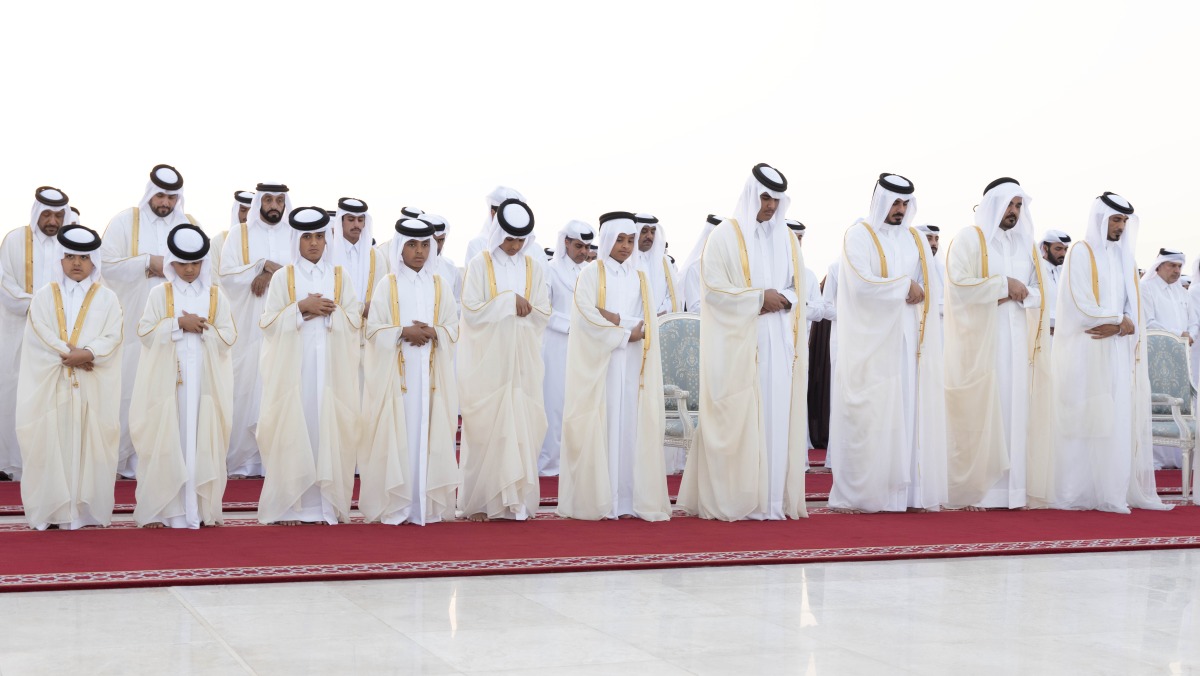 Also performing the prayer were Personal Representative of HH the Amir, HH Sheikh Jassim bin Hamad Al Thani; HH Sheikh Abdullah bin Khalifa Al Thani; HH Sheikh Mohammed bin Khalifa Al Thani; Speaker of the Shura Council HE Hassan bin Abdullah Al Ghanem, and a number of Their Excellencies sheikhs, ministers, members of the Shura Council, and a number of Their Excellencies ambassadors and heads of diplomatic missions in the country.