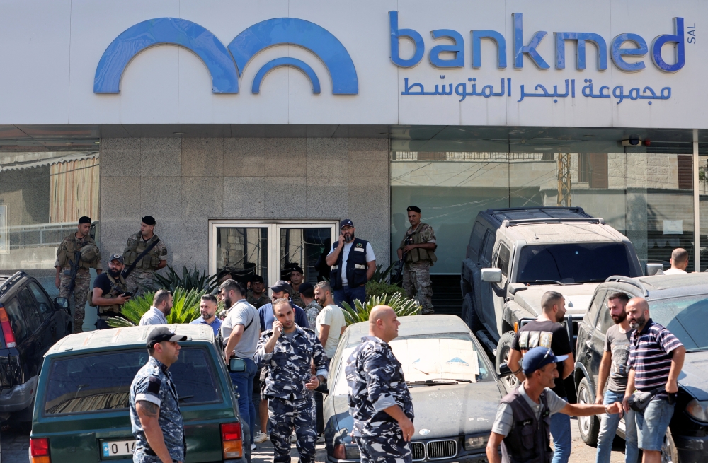 Members of police and army stand guard outside a Bankmed branch, in town of Chehime, Lebanon, on September 16, 2022. (REUTERS/Aziz Taher)