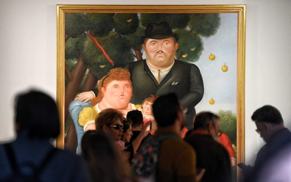 Visitors look at the painting "Una Familia" (A Family) by Colombian artist Fernando Botero at the Botero Museum in Bogota on September 15, 2023. (Photo by Juan Barreto / AFP)