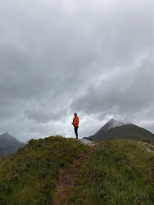 The author's husband stands on a rocky ridge high above Kinlochleven overlooking Loch Leven on the way to Fort William. Photo for The Washington Post by Kathryn Streeter