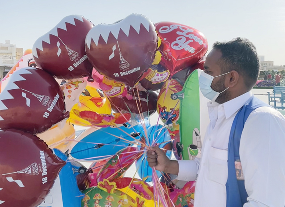 Who doesn’t love balloons? These are likewise for sale where balloonist roam around Souq Waqif. Ansar from Kerala, India said: “We have this heart-shaped designed balloon with the Qatar National Day logo along with the date “18 December” on one side, and the photo of H H the Amir on the other side.”