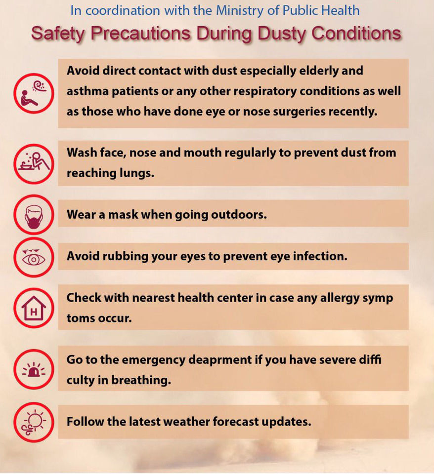 “Widespread dust is affecting the country with strong Northwesterly wind causing visibility to drop below 1 km in most areas. Please take extra care and follow attached (given below) safety tips as dusty conditions expected to continue until night time,” the Met added.