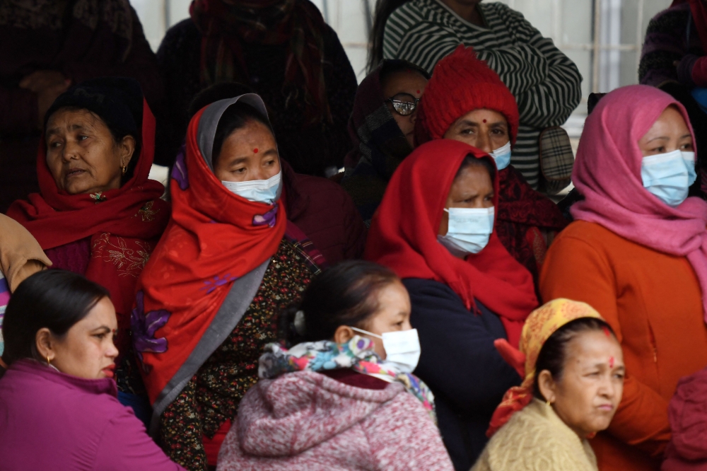 Family members of victims who died in the Yeti Airlines plane crash wait outside a hospital, in Pokhara on January 17, 2023. (Photo by PRAKASH MATHEMA / AFP)
