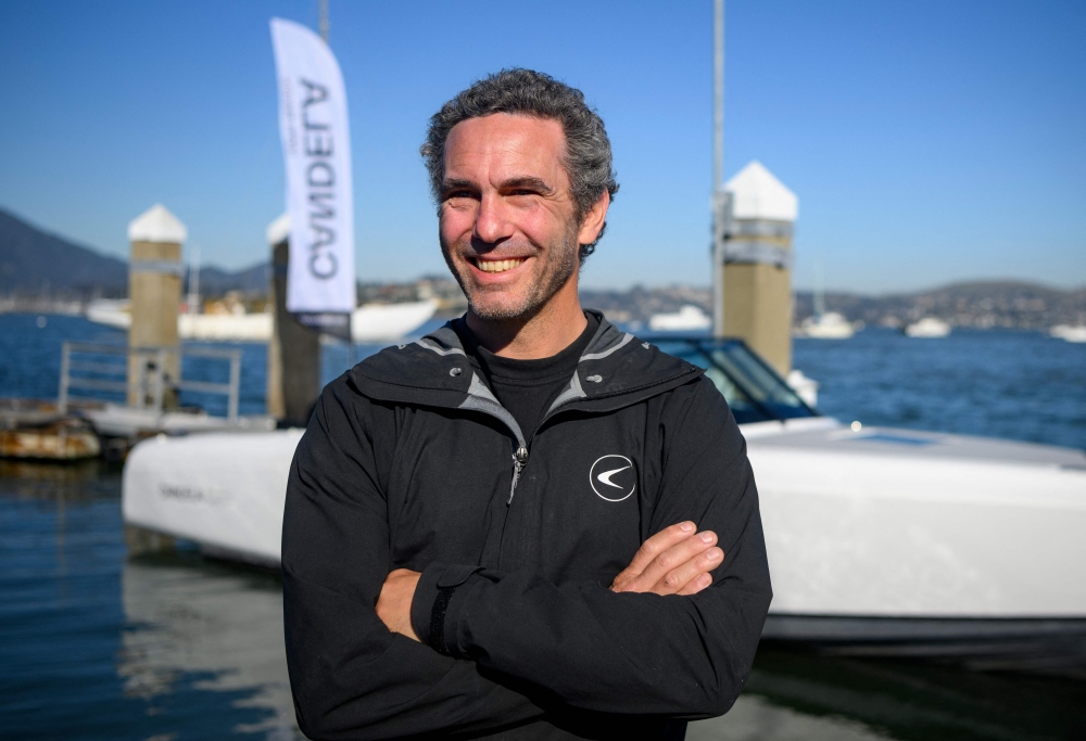 French sailor Tanguy de Lamotte, CEO of Candela US, poses for photos during a media demonstration day near the company's "flying" electric C-8 boat in Sausalito, California on February 8, 2023.