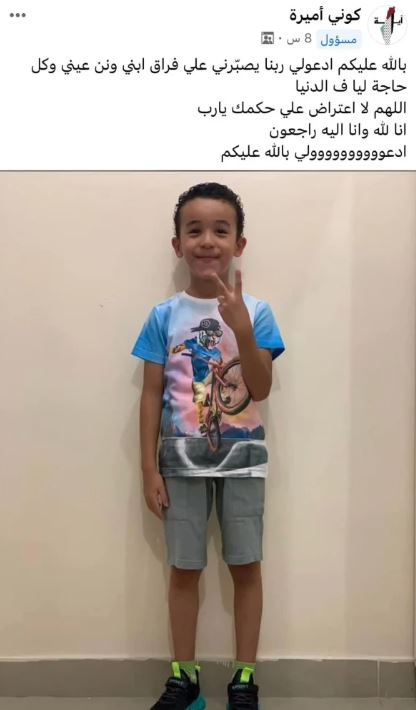 Screenshots of the deceased child's mother sharing her pain in a community page on Facebook along with the child's picture has gone viral. She wrote, in Arabic, that roughly translates to, "I implore you, pray for me. May our Lord grant me patience in the face of the loss of my son, the apple of my eye, and everything to me in this world. Please pray for me."