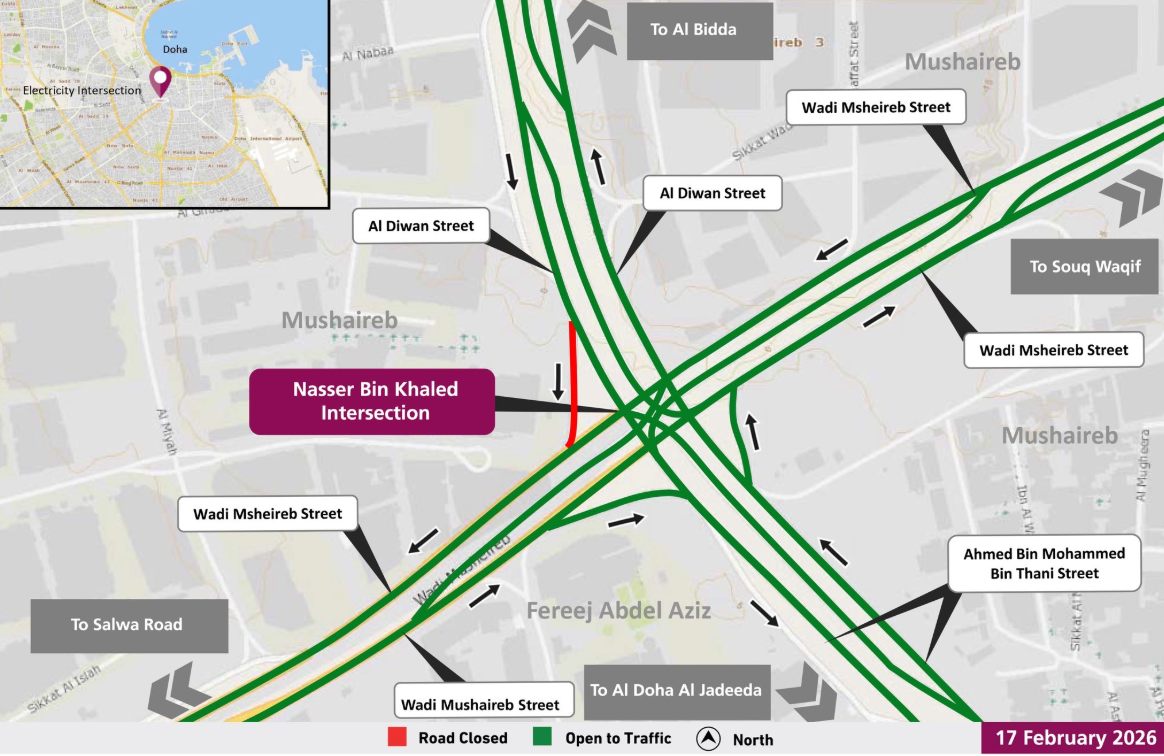 Doha, Qatar: The Public Works Authority, Ashghal, announced a partial nighttime closure for five hours at Nasser Bin Khaled Intersection, during which the free right turn for traffic coming from Al Diwan Street toward Wadi Mushaireb Street will be closed.