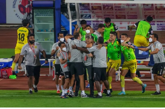 Hyderabad FC coach and players celebrate entering the final of ISL.