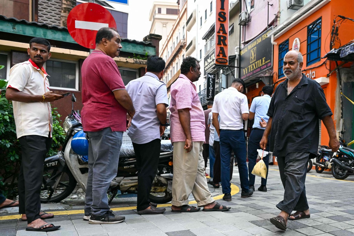 This picture taken on March 7, 2025 shows a Muslim man (R) carrying a packet of popular dish 'Bubur Lambuk' as other queue outside the Masjid India during the Muslim holy fasting month of Ramadan in Kuala Lumpur. (Photo by Mohd RASFAN / AFP)