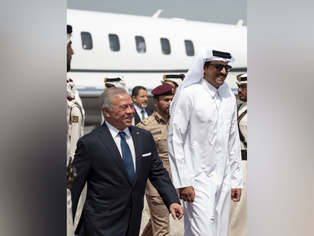 Doha, Qatar: The Amir His Highness Sheikh Tamim bin Hamad Al-Thani received His Majesty Abdullah II bin Al-Hussein, King of the Hashemite Kingdom of Jordan, upon his arrival this morning at Doha International Airport, along with the accompanying delegation, for a working visit to the country.