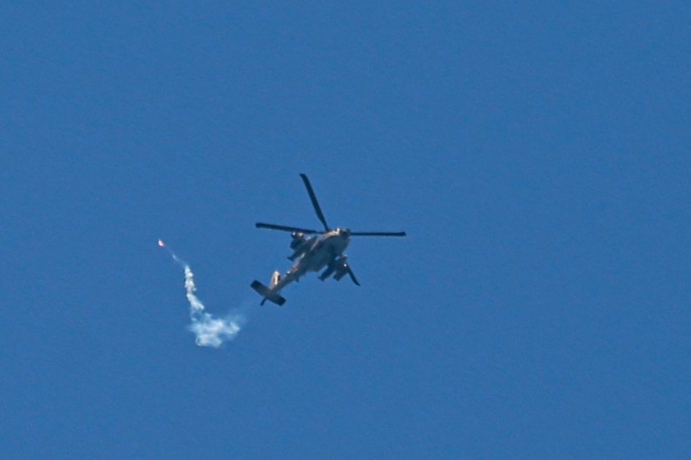 An Israeli Air Force attack helicopter fires a flare during a flyover above Nuseirat in the central Gaza Strip on April 17, 2024. (Photo by AFP)