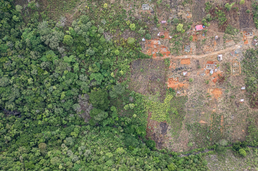 An aerial view of houses encroaching next to the Tacugama Chimpanzee Sanctuary in Freetown, on April 24, 2025.