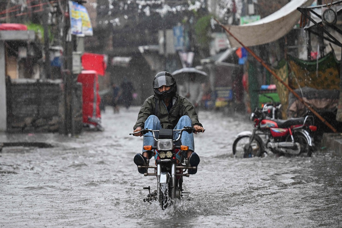 A man on a motorbike wades through a flooded street during heavy monsoon rains in Rawalpindi on July 17, 2025. Photo by Aamir QURESHI / AFP