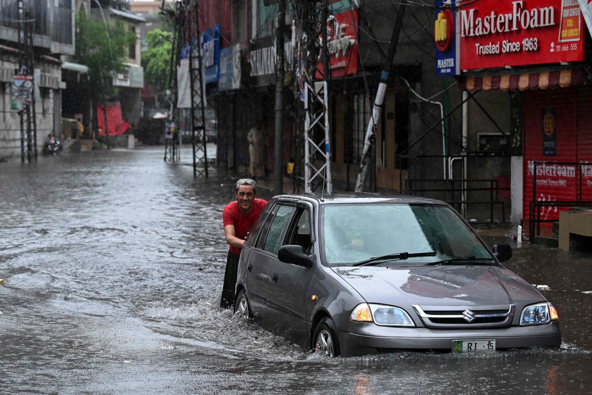 A man pushes a car through a flooded street during heavy monsoon rains in Rawalpindi on July 17, 2025. Photo by Aamir QURESHI / AFP