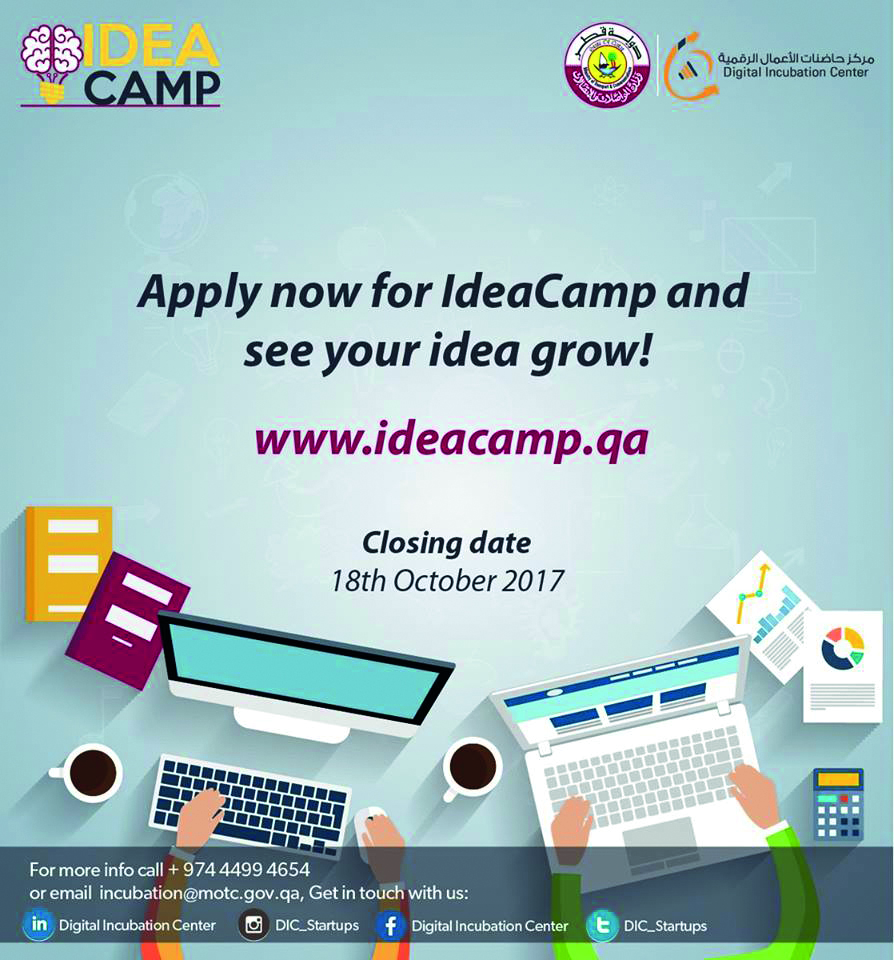 According to information shared on the Ministry’s social media accounts and ideacamp.qa website, applicants will develop a business model, build a prototype and test his/her idea with customers through a series of workshops, training and mentorship. The Ministry is encouraging talented entrepreneurs to “apply now for IdeaCamp and see your idea grow!” on its social media pages.