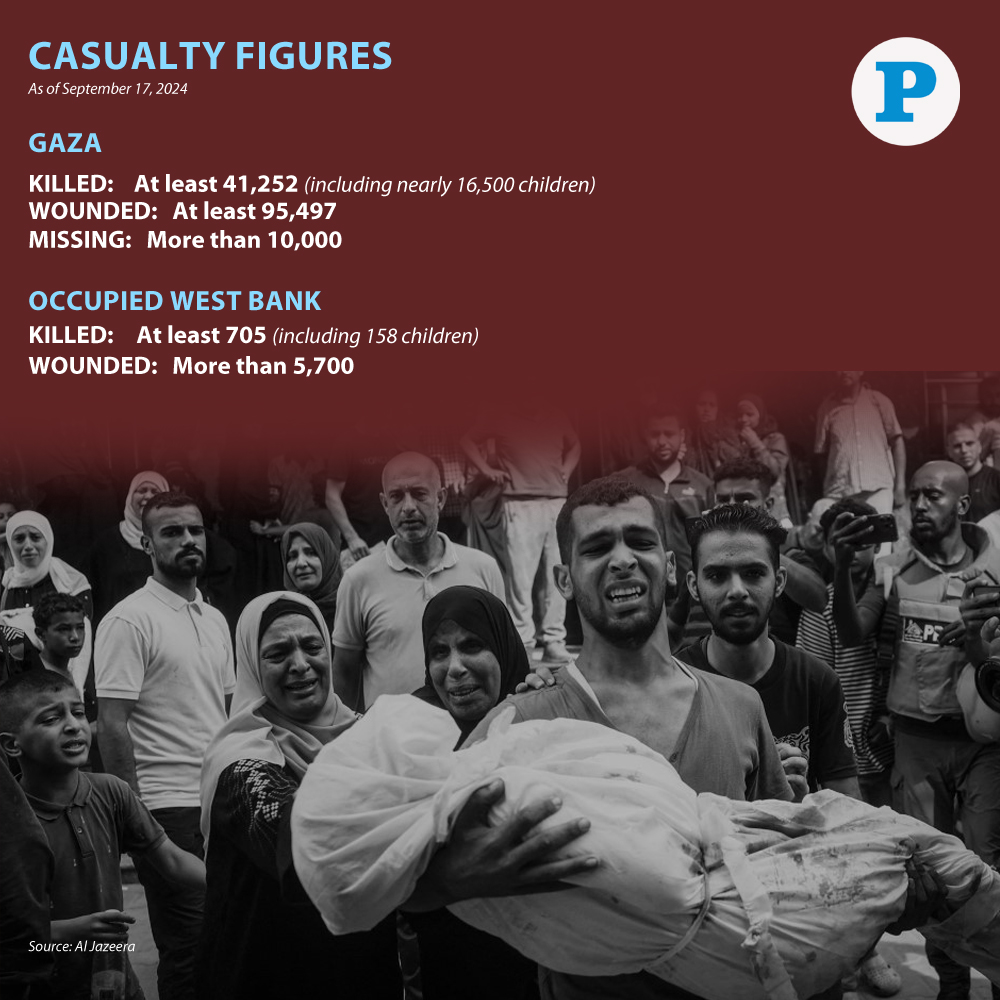 Gaza: The Palestinian Ministry of Health in Gaza said that the death toll from the Israeli onslaught on the Gaza Strip since October 7, has risen to 41,252 martyrs and 95,497 injured.