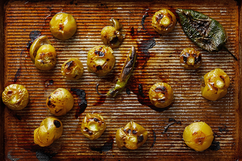 Preheat the broiler with a rack placed about 4 inches from the heating element. Arrange the tomatillos, poblano and serrano on a large rimmed baking sheet. Broil for about 10 minutes, turning the vegetables over halfway through, until they are blistered and black in spots. Let the vegetables cool, and pull the stems off the peppers. Reduce the oven temperature to 350 degrees and move the rack to the middle.