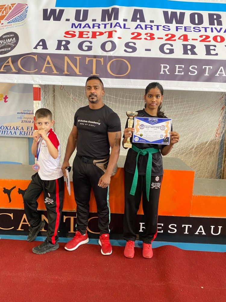 The participants namely, Shilpy Ghose (India), Yagiz Sari (Turkiye), Musbah Mohamed Osman Elyas Mohamed Salih (Sudan), Jonna Dixie Prevendido Cordova (Philippines), nine-year-old Anthony Georges El Khoury (Lebanon) and 14-year-old Devakshi Grace Mukherjee (India) with their Coach Dammika Sujith Gunasiri (Sri Lanka) and parents traveled to Argos, Greece. They competed against athletes from several other nations for the two-day WUMA Kickboxing World Championship held on the September 23.