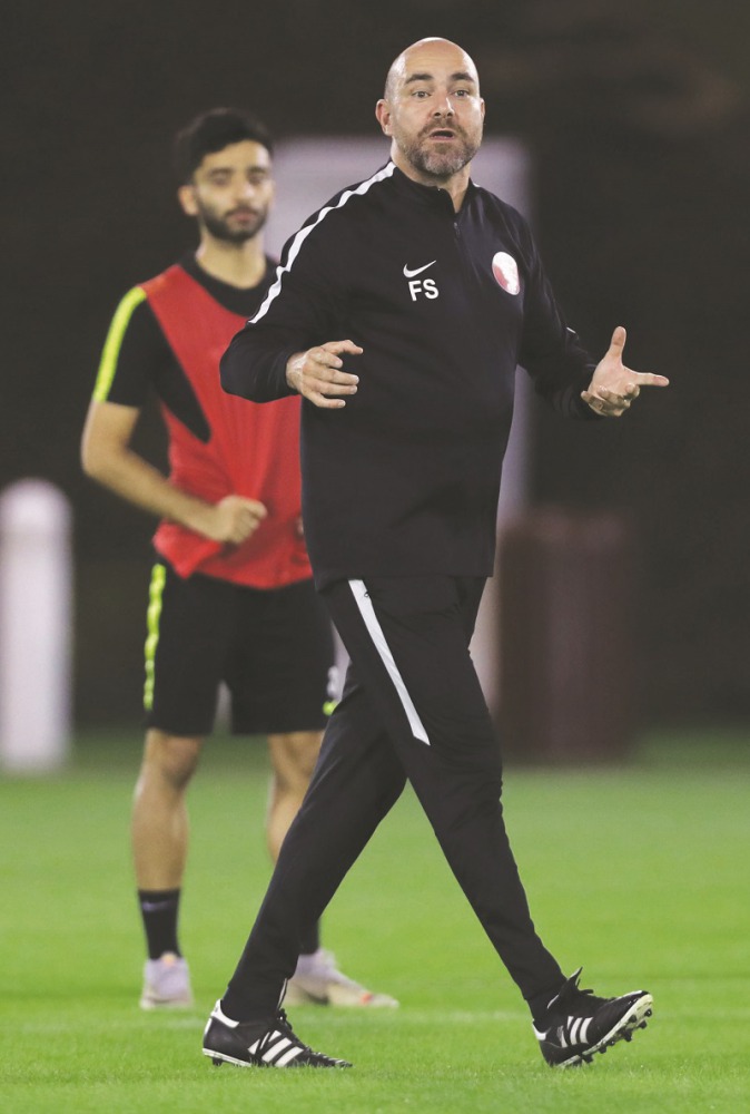 Qatar coach Felix Sanchez gestures as Al Annabi players train in Doha as they gear up for the return leg of the 2022 World Cup and 2023 AFC Asian Cup joint qualifiers against Afghanistan.