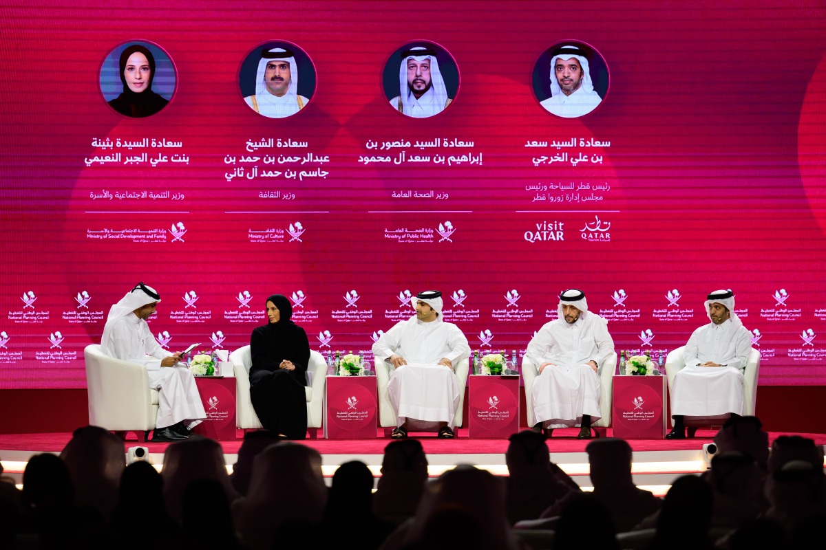 The speech was followed by a panel session featuring the Minister of Social Development and Family, H E Buthaina bint Ali Al Jabr Al Nuaimi; Minister of Culture, H E Sheikh Abdulrahman bin Hamad bin Jassim bin Hamad Al Thani; Minister of Public Health, H E Mansoor bin Ebrahim bin Saad Al Mahmoud; and Chairman of Qatar Tourism and Chairman of the Board of Visit Qatar, H E Saad bin Ali Al Kharji. They underscored the need to build a consolidated society where individuals enjoy a high quality of life, driven by active participation and a strong sense of shared responsibility.
