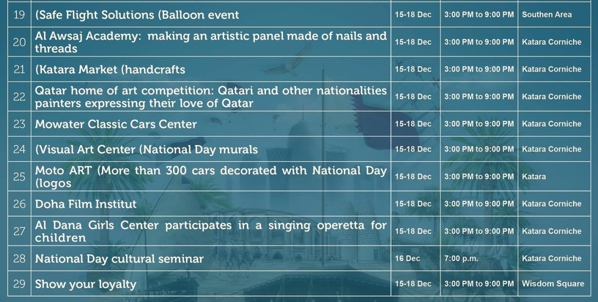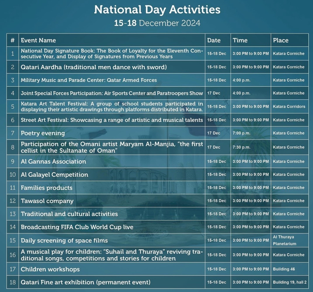Additionally, the BEDAR Initiative at the Al Khor Barwa Workers Recreation Complex will host a musical concert, a National Day parade, a workers' talent show, and more.